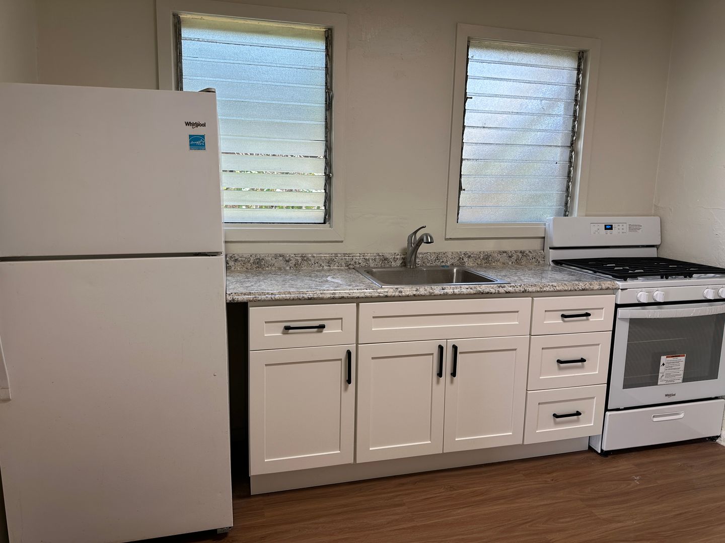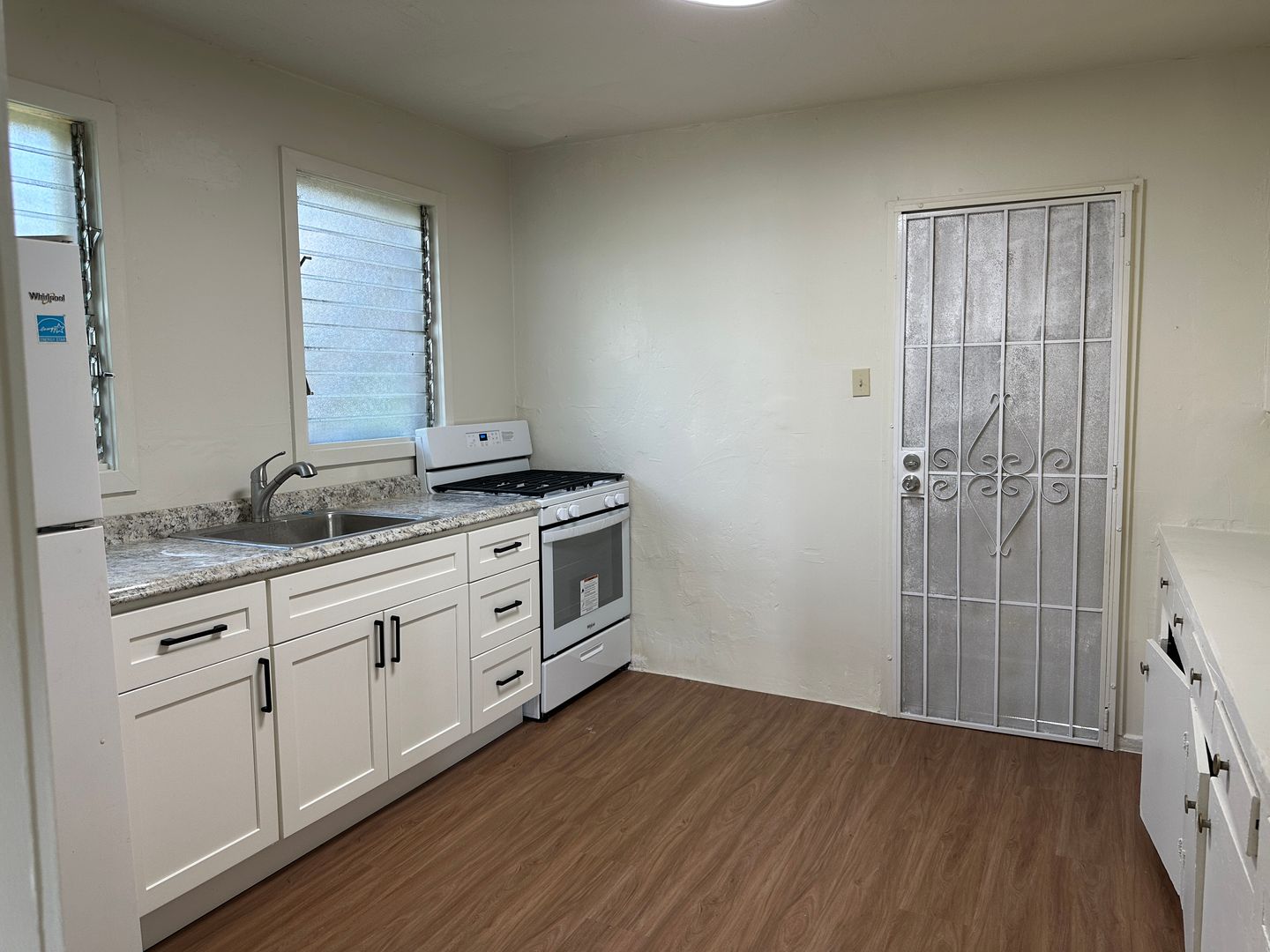 800 Sq. Ft. ground floor 2 bedroom 1 bath unit with new flooring throughout, newly painted, partial kitchen and bathroom remodel. Very bright and breezy.