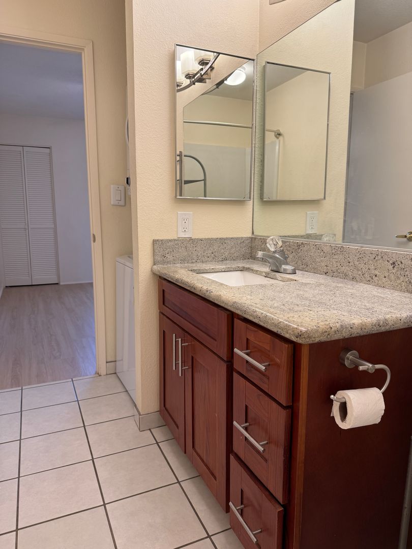 Spacious and well-maintained 1-bedroom in the highly desirable Crosspointe community. This inviting unit features an open lanai at the front. Modern upgrades including newer kitchen and bathroom cabinetry, new vinyl flooring throughout, and fresh interior paint. Stay comfortable year-round with A/C units, and appreciate the convenience of an in-unit washer and dryer. Comes with two parking stalls.